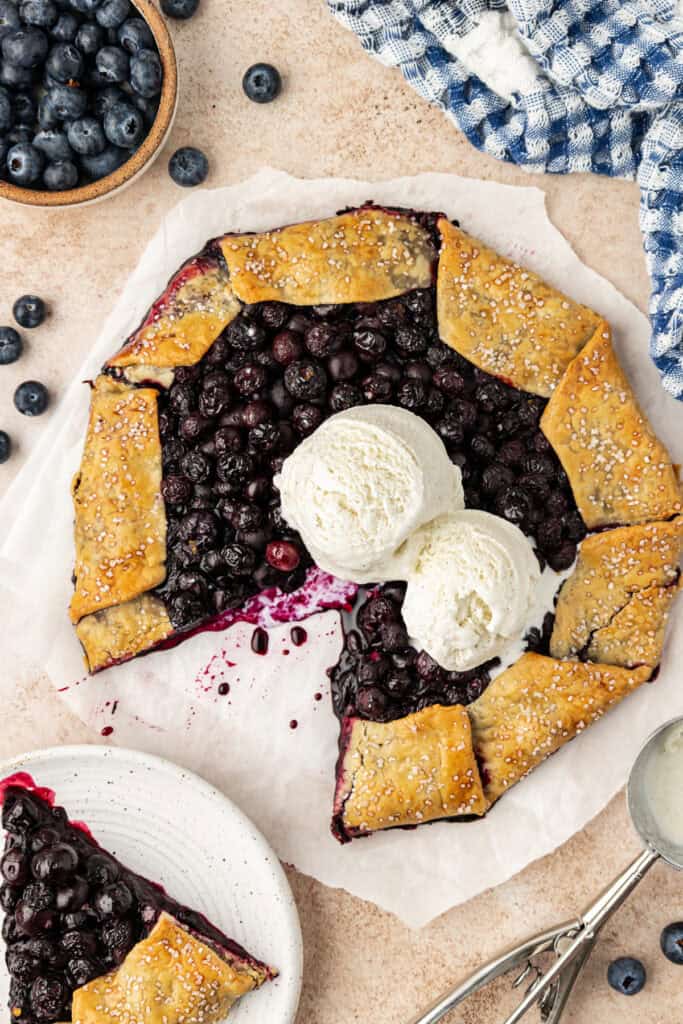 I love serving this blueberry galette with vanilla ice cream. Or serve with a different flavor, like lemon ice cream or sorbet instead!