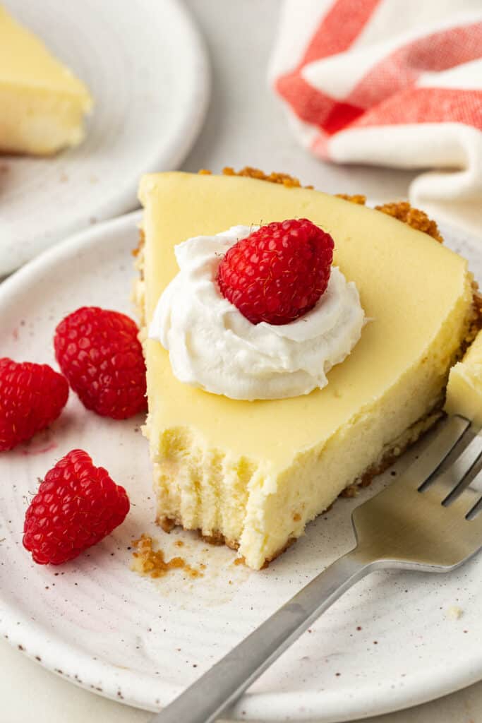 This cheesecake pie is basically half of my vanilla cheesecake so it’s not a bit smaller, not as thick. This means you don’t need to bake it in a springform pan but will bake in a pie dish without a water bath since the filling isn’t as tall.