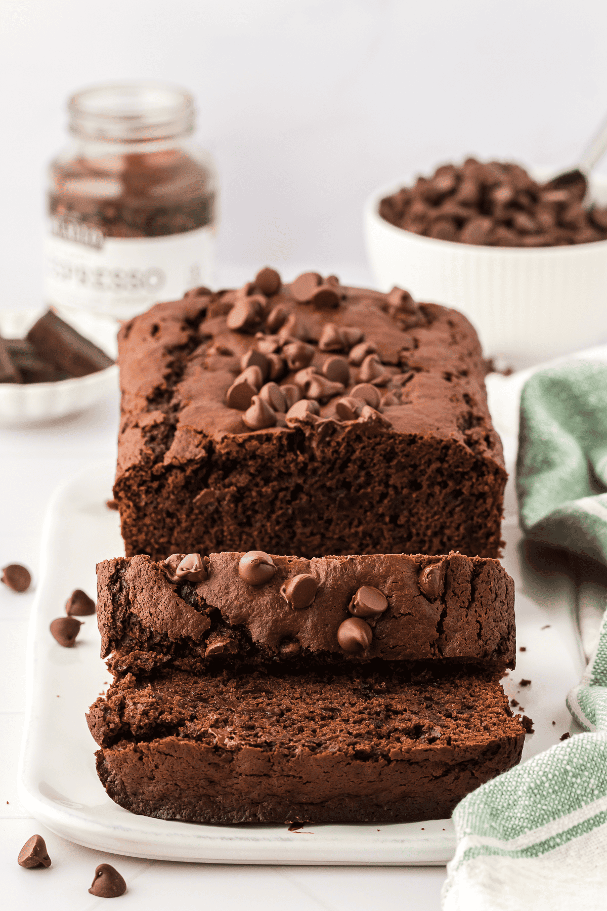 Now, it’s probably obvious but I’m a big fan of chocolate (like this Chocolate Zucchini Bread!), so I was really excited to try this recipe after creating it. And boy oh boy I was not disappointed! This chocolate bread recipe is so moist and fluffy, and the semi-sweet chocolate chips and cocoa powder add the perfect amount of sweetness and richness. I could have eaten the whole chocolate bread myself! I added a little bit of espresso powder, which just helps make the chocolate stand out even more. Don’t skip it!