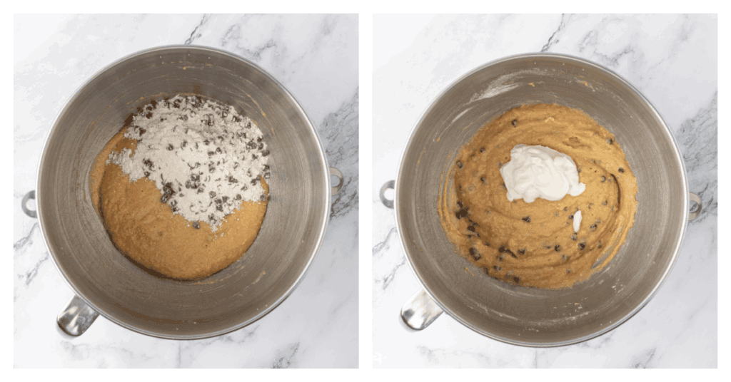 - Alternate dry with sour cream. Add the flour mixture, alternately with the sour cream in 3 additions, starting and ending with the flour. 1 cup (227 g) sour cream 1 cup (170 g) mini chocolate chips