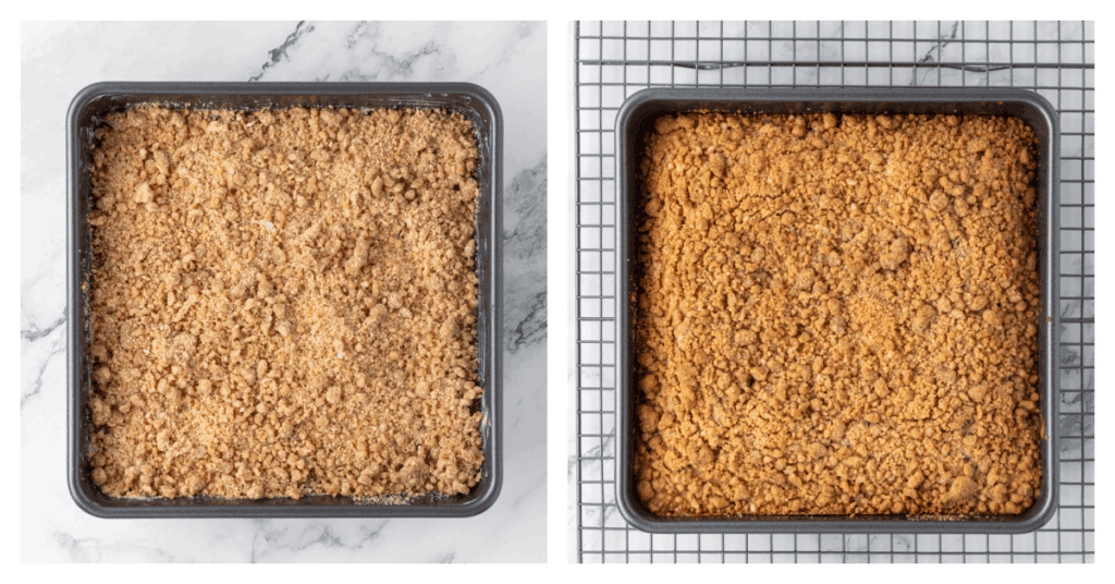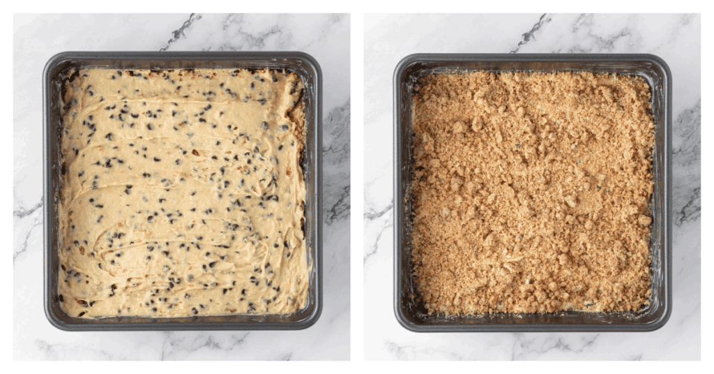 Add the rest of the batter, smoothing it as best you can, then finish with the remaining crumb topping.