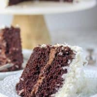 This chocolate coconut cake recipe is like eating an Almond Joy in cake form! A rich chocolate cake layered with a chocolate ganache frosting, and covered in a coconut buttercream, and more coconut!
