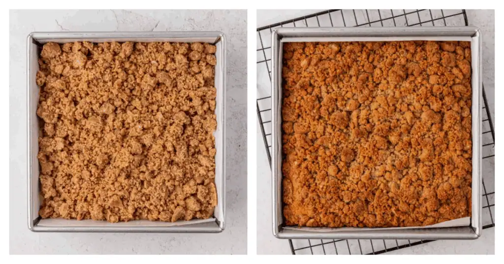 - Bake. Add the batter to the prepared pan. Crumble the topping evenly over the top of the cake batter breaking it up into small clumps. Bake for 40-45 minutes until the cake is done when it's golden brown around the edges and toothpick inserted into the center comes out clean. Remove cake from the oven and allow it to cool before serving.