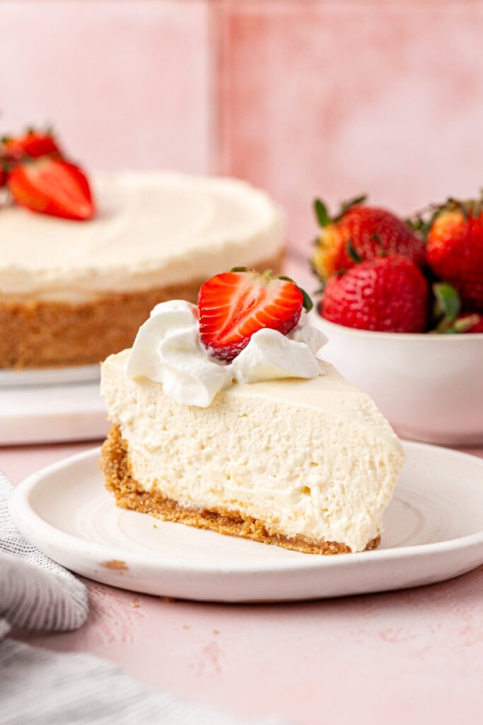 This easy no bake cheesecake is perfect for any special occasion! This vanilla no bake cheesecake recipe is made with a homemade graham cracker crust, and is velvety smooth. No need for turning the oven on or preparing a hot water bath for this no bake cheesecake.