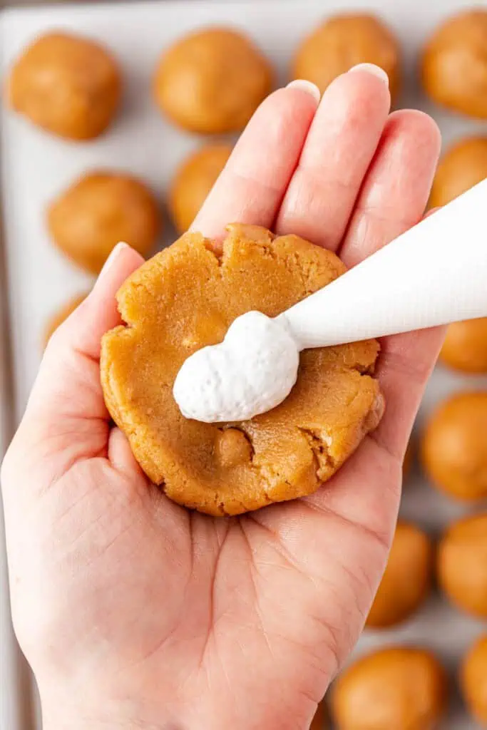 Flatten the cookie dough and place about 1 ½ – 2 teaspoons fluff in the middle and fold the cookie dough around the fluff. You can use two spoons to place the fluff in the middle or pipe the fluff into the center.