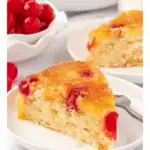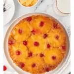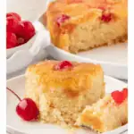 This is a light and fluffy homemade pineapple upside down cake recipe that’s so easy to mix up. An easy vanilla cake batter is baked with a brown sugar pineapple topping with maraschino cherries. The vanilla cake is made with melted butter, so this pineapple upside down cake recipe comes together in less than 30 minutes!