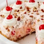 Top with the remaining whipped cream. Garnish with additional cherries and pecans, if desired. Cut into slices and serve. Refrigerate the pie until ready to serve. You can also use a pastry bag to pipe swirls of whipped cream onto the pie just before serving. Or try my stabilized whipped cream that holds up longer!