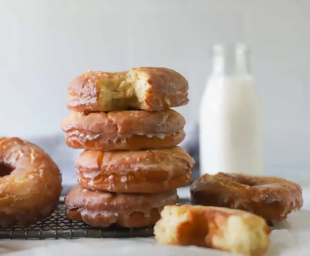 - Make the glaze by whisking together the glaze ingredients. Dip each donut, both sides, into the glaze once they’re cooled.