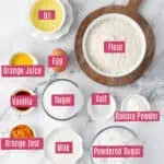 - Combine dry ingredients. In a mixing bowl, combine the sugar and orange zest. Rub the zest into your fingertips. Add the all-purpose flour, baking powder, and salt and whisk to combine. Set aside. 1 cup (200 g) granulated sugar 2 Tablespoons orange zest 2 cups (240 g) all-purpose flour 1 Tablespoon baking powder ½ teaspoon salt