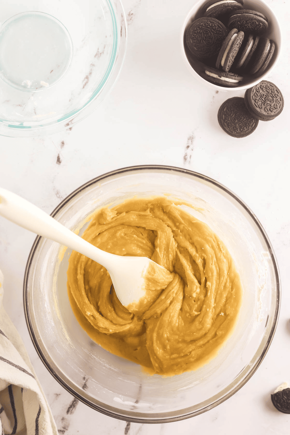 - Fold in Oreos. Using a rubber spatula, fold in 20 crushed Oreo cookies. Spread batter into prepared pan. Crush up remaining 4 cookies on top of the batter.