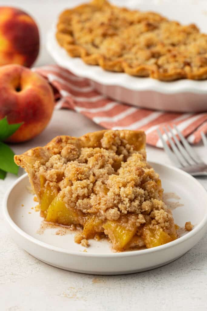 The best peach crumble pie recipe made with a homemade pie crust, fresh peaches, and a brown sugar crumble on top!