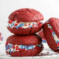 You have done it yet AGAIN! Anything Red Velvet is absolutely AMAZING in my book. Whoopie Pies…seriously? ! Oh my goodness! That is enough wonderfulness to last a while! Red Velvet, Buttercream AND Sprinkles…YANKEE DOODLE DANDY!!