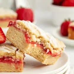 These easy strawberry bars are made with a fresh strawberry filling, and sweet sugar cookie layer. The same dough is used for both the top and bottom layers of the bars so these strawberry bars come together quickly! Perfect for strawberry season!