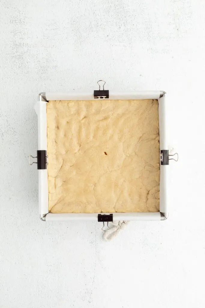 - Add the remaining dough to the 8×8 baking pan pressing down into an even layer making sure to spread the dough all the way to the sides.