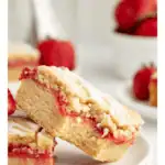 To make them, you’ll start by mixing up a classic sugar cookie dough. Most of it gets pressed into the bottom of the pan to create a soft, buttery base, and the rest is saved for crumbling over the top. The filling is a quick homemade strawberry jam—just fresh berries, sugar, and lemon juice simmered on the stovetop until thick and glossy. Once everything’s layered up and baked to golden perfection, a simple vanilla glaze is drizzled over the top for a sweet, glossy finish.