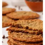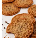 These thin and crispy chocolate chip cookies are perfectly golden, buttery, and crisp all the way through. They have that classic crackly edge, a caramelized flavor, and just the right amount of chocolate in every bite. If you love a cookie with a satisfying crunch instead of a soft center, this is the one to make. No mixer and no chilling required!