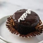 To fill the cupcakes: use the cone method by cutting out the center out of the cupcake at an angle about two-thirds of the way down. Save the top of the cupcake and simply trim off the bottom so you can replace the top of the cupcake once you have filled them with the marshmallow creme. Using a piping bag or a Ziploc bag with a corner snipped off, fill the center of each cupcake with the marshmallow creme. Just be sure not to overfill. If you fill above the cupcake, simply use a small spatula to scrape off the top. Place the trimmed top that you saved back on the cupcake. You will need some of this icing to pip swirls on top.