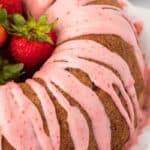 Make the glaze. Mix all ingredients until smooth. Pour over top of cake and serve. For a thicker glaze use less heavy cream. 2 ounces cream cheese 1 cups (113 grams) powdered sugar 3-4 Tablespoons (42 grams) heavy cream ¼ teaspoon vanilla extract .5 ounces (half a bag) freeze-dried strawberries