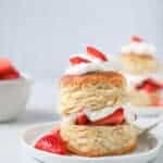 Bake the biscuits. Arrange biscuits onto either parchment lined cookie sheet, in a round baking dish or in a cast iron. Place them close together edges touching for fluffy pull apart biscuits. For crispier edges space them apart from each other. Top with a sprinkle of turbinado sugar. Bake for 15 minutes until golden brown.